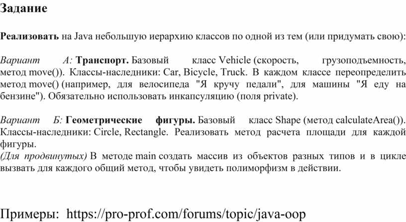 Вариант А: Транспорт. Базовый класс Vehicle (скорость, грузоподъемность, метод move()). Классы-наследники: Car, Bicycle, Truck. В каждом классе переопределить метод move() (например, для велосипеда "Я кручу педали", для машины "Я еду на бензине"). Обязательно использовать инкапсуляцию (поля private).