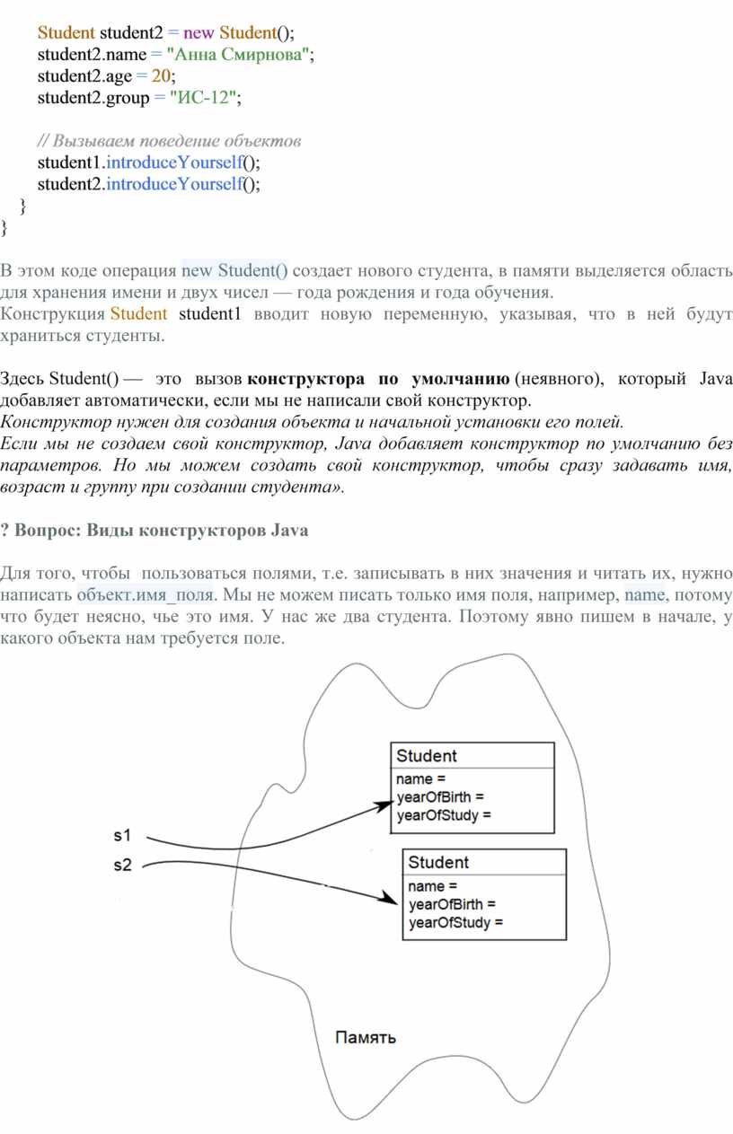 Если мы не создаем свой конструктор, Java добавляет конструктор по умолчанию без параметров. Но мы можем создать свой конструктор, чтобы сразу задавать имя, возраст и группу при создании студента».