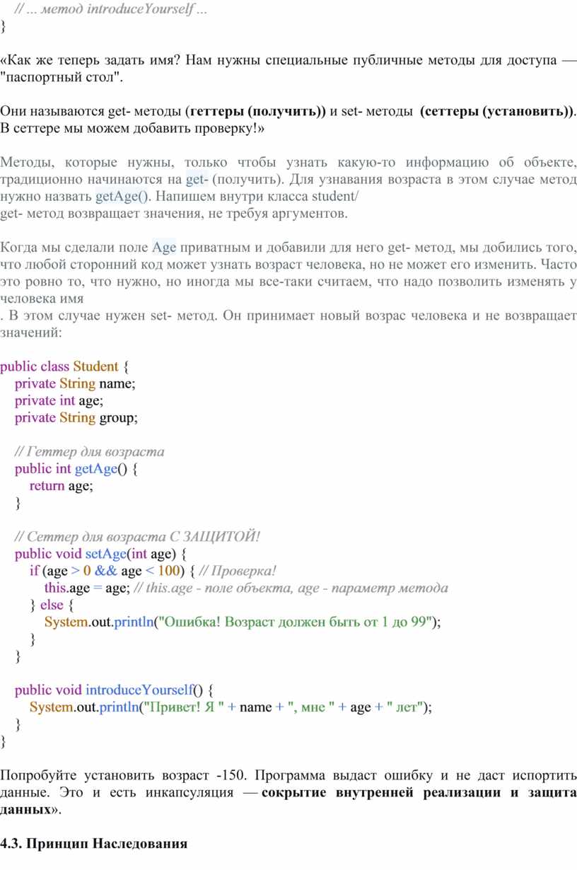 Попробуйте установить возраст -150. Программа выдаст ошибку и не даст испортить данные. Это и есть инкапсуляция — сокрытие внутренней реализации и защита данных».