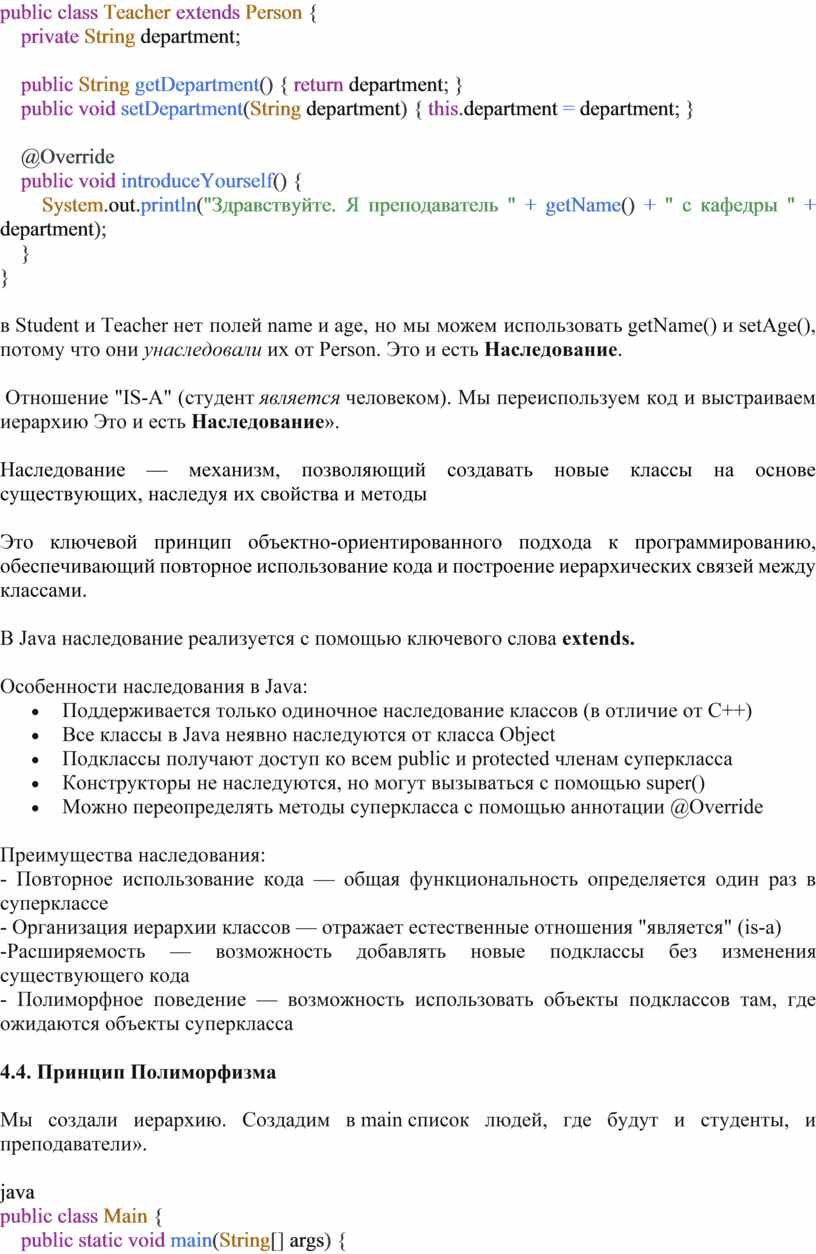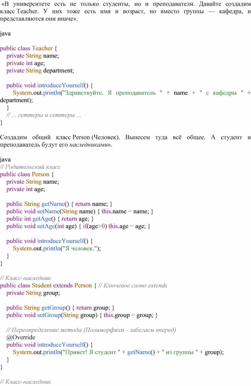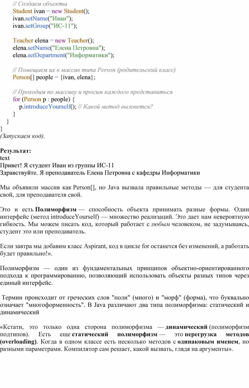 Это и есть Полиморфизм — способность объекта принимать разные формы. Один интерфейс (метод introduceYourself) — множество реализаций. Это дает нам невероятную гибкость. Мы можем писать код, который работает с любым человеком, не задумываясь, студент это или преподаватель.