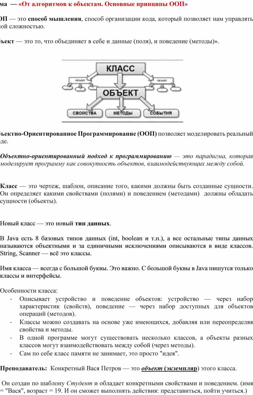 Преподаватель: Конкретный Вася Петров — это объект (экземпляр) этого класса.