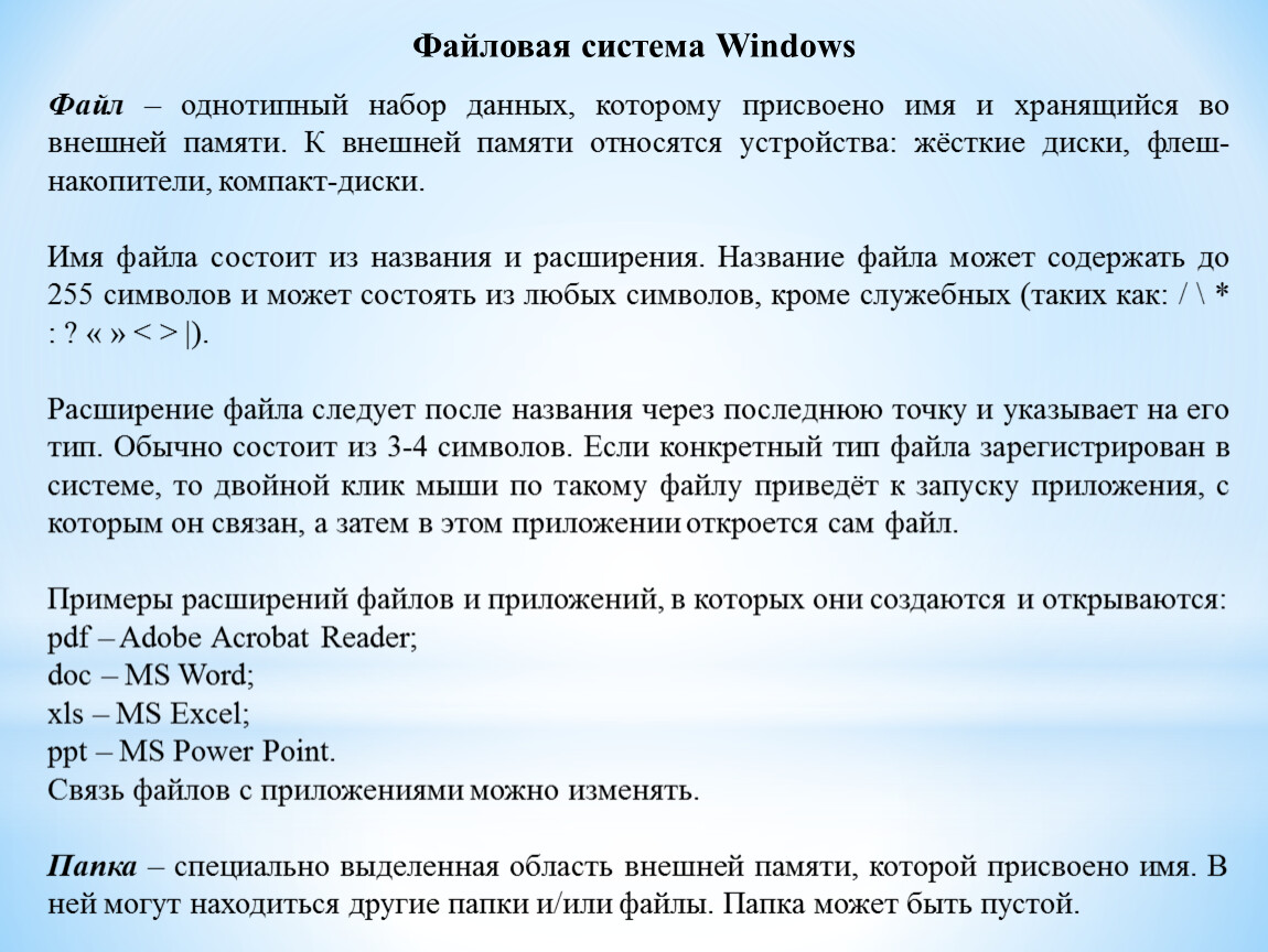 Файл – однотипный набор данных, которому присвоено имя и хранящийся во внешней памяти. К внешней памяти относятся устройства: жёсткие диски, флеш-накопители, компакт-диски.