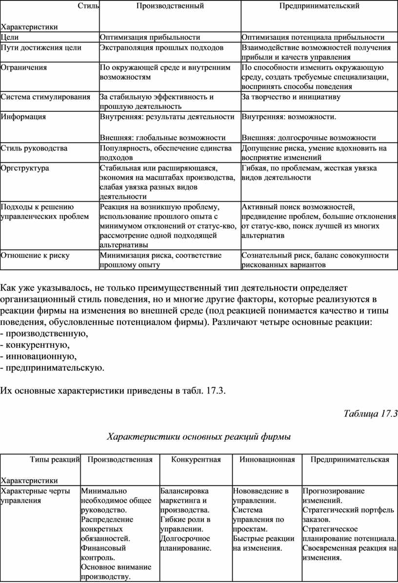 Различия в организационном облике фирм, преимущественно придерживающихся крайних стилей, характеризуются табл. 17.2.