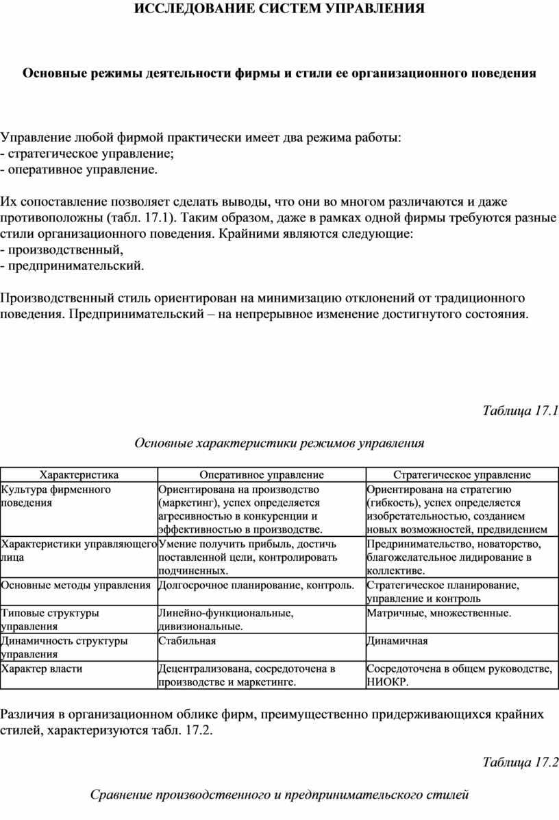 Основные режимы деятельности фирмы и стили ее организационного поведения