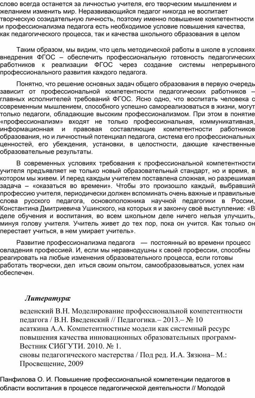 1. Введенский В.Н. Моделирование профессиональной компетентности педагога / В.Н. Введенский // Педагогика. – 2013.– № 10