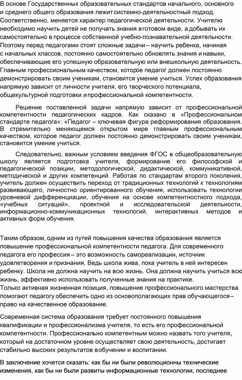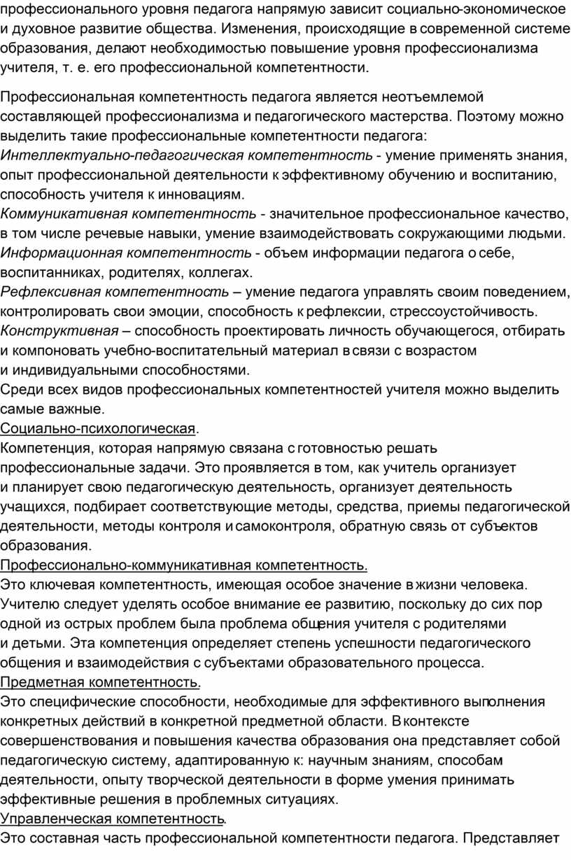 Современная система образования требует постоянного повышения квалификации и профессионализма учителя, то есть его профессиональной компетентности. Профессионально компетентным можно назвать того учителя, который на достаточном уровне осуществляет свою деятельность, достигает стабильно высоких результатов в обучении и воспитании.