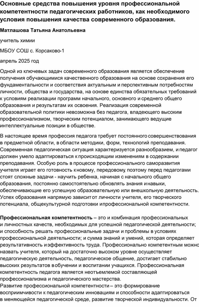 Основные средства повышения уровня профессиональной компетентности педагогических работников, как необходимого условия повышения качества современного образования.