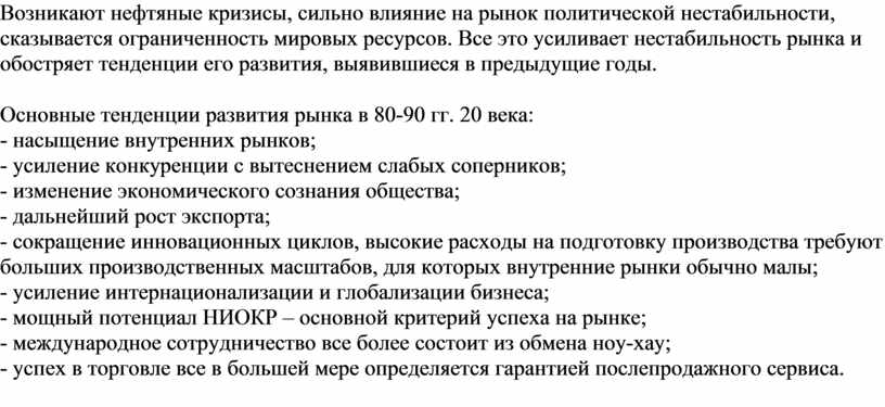 Возникают нефтяные кризисы, сильно влияние на рынок политической нестабильности, сказывается ограниченность мировых ресурсов. Все это усиливает нестабильность рынка и обостряет тенденции его развития, выявившиеся в предыдущие годы.