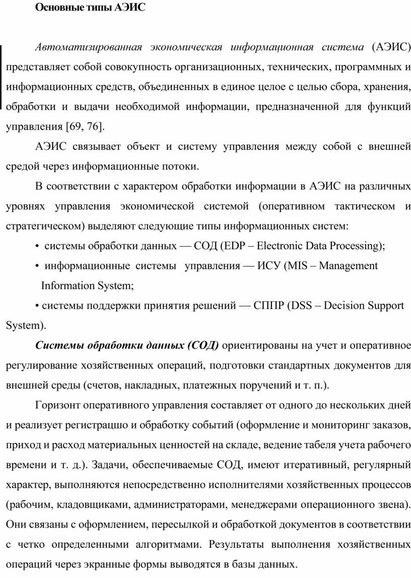 В соответствии с характером обработки информации в АЭИС на различных уровнях управления экономической системой (оперативном тактическом и стратегическом) выделяют следующие типы информационных систем: