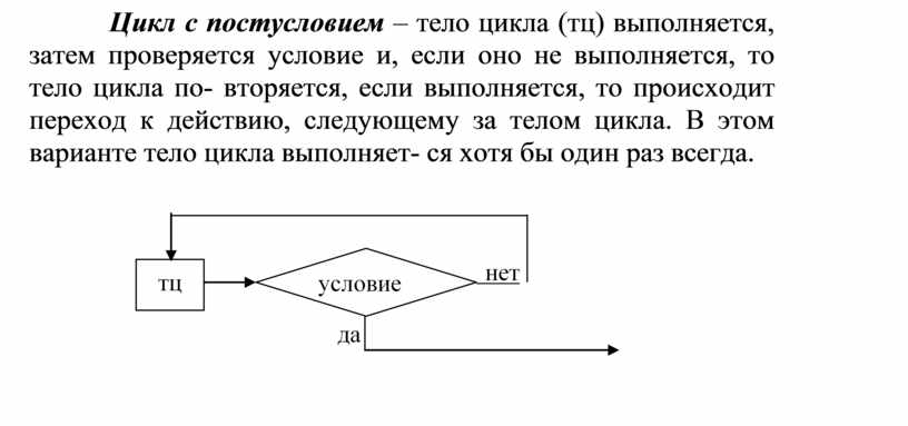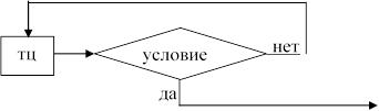 Цикл с постусловием – тело цикла (тц) выполняется, затем проверяется условие и, если оно не выполняется, то тело цикла по- вторяется, если выполняется, то происходит переход к действию, следующему за телом цикла. В этом варианте тело цикла выполняет- ся хотя бы один раз всегда.