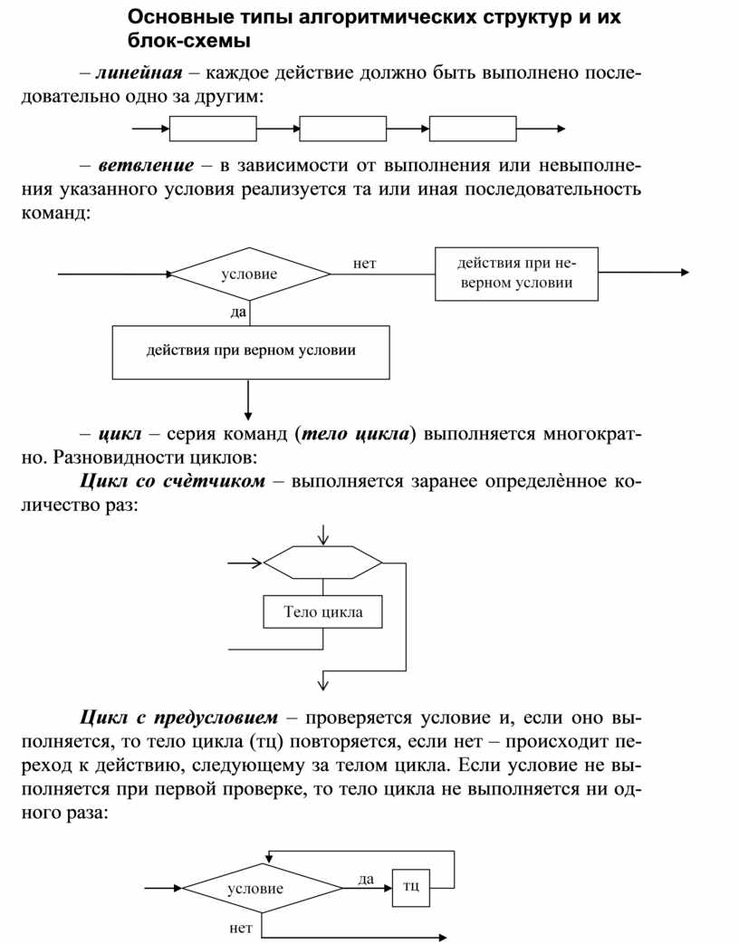 Цикл с предусловием – проверяется условие и, если оно вы- полняется, то тело цикла (тц) повторяется, если нет – происходит пе- реход к действию, следующему за телом цикла. Если условие не вы- полняется при первой проверке, то тело цикла не выполняется ни од- ного раза: