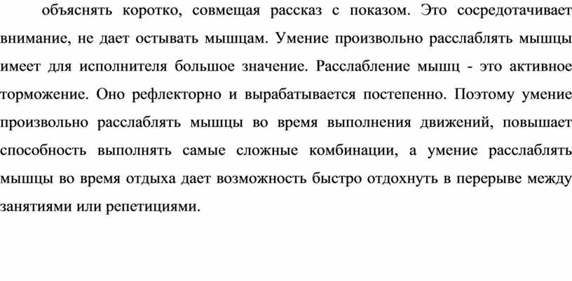 С мышцами и связками нужно обращаться бережно, развивать без насилия, тренировать, не переходя предела возможностей данного организма. Нельзя требовать невозможного. Неравномерность нагрузки приводит к травмам. Тренаж должен проводиться так, чтобы пауз было как можно меньше, движения объяснять коротко, совмещая рассказ с показом. Это сосредотачивает внимание, не дает остывать мышцам. Умение произвольно расслаблять мышцы имеет для исполнителя большое значение. Расслабление мышц - это активное торможение. Оно рефлекторно и вырабатывается постепенно. Поэтому умение произвольно расслаблять мышцы во время выполнения движений, повышает способность выполнять самые сложные комбинации, а умение расслаблять мышцы во время отдыха дает возможность быстро отдохнуть в перерыве между занятиями или репетициями.