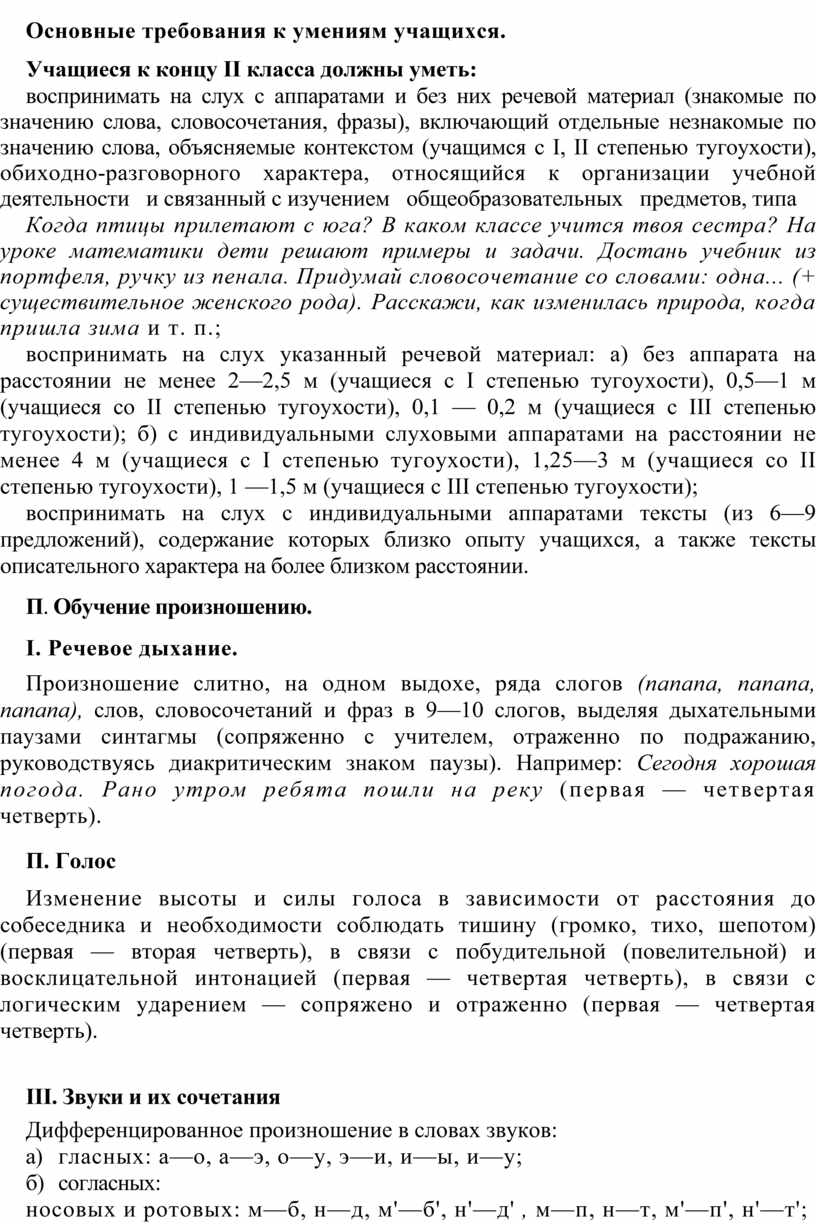 воспринимать на слух с аппаратами и без них речевой материал (знакомые по значению слова, словосочетания, фразы), включающий отдельные незнакомые по значению слова, объясняемые контекстом (учащимся с I, II степенью тугоухости), обиходно-разговорного характера, относящийся к организации учебной деятельности и связанный с изучением общеобразовательных предметов, типа