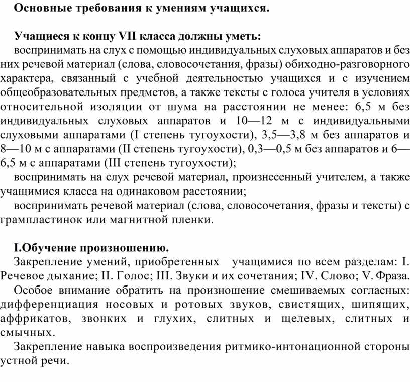 воспринимать на слух с помощью индивидуальных слуховых аппаратов и без них речевой материал (слова, словосочетания, фразы) обиходно-разговорного характера, связанный с учебной деятельностью учащихся и с изучением общеобразовательных предметов, а также тексты с голоса учителя в условиях относительной изоляции от шума на расстоянии не менее: 6,5 м без индивидуальных слуховых аппаратов и 10—12 м с индивидуальными слуховыми аппаратами (I степень тугоухости), 3,5—3,8 м без аппаратов и 8—10 м с аппаратами (II степень тугоухости), 0,3—0,5 м без аппаратов и 6—6,5 м с аппаратами (III степень тугоухости);