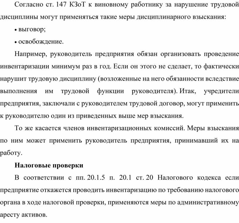 Например, руководитель предприятия обязан организовать проведение инвентаризации минимум раз в год. Если он этого не сделает, то фактически нарушит трудовую дисциплину (возложенные на него обязанности вследствие выполнения им трудовой функции руководителя). Итак, учредители предприятия, заключали с руководителем трудовой договор, могут применить к руководителю один из приведенных выше мер взыскания.