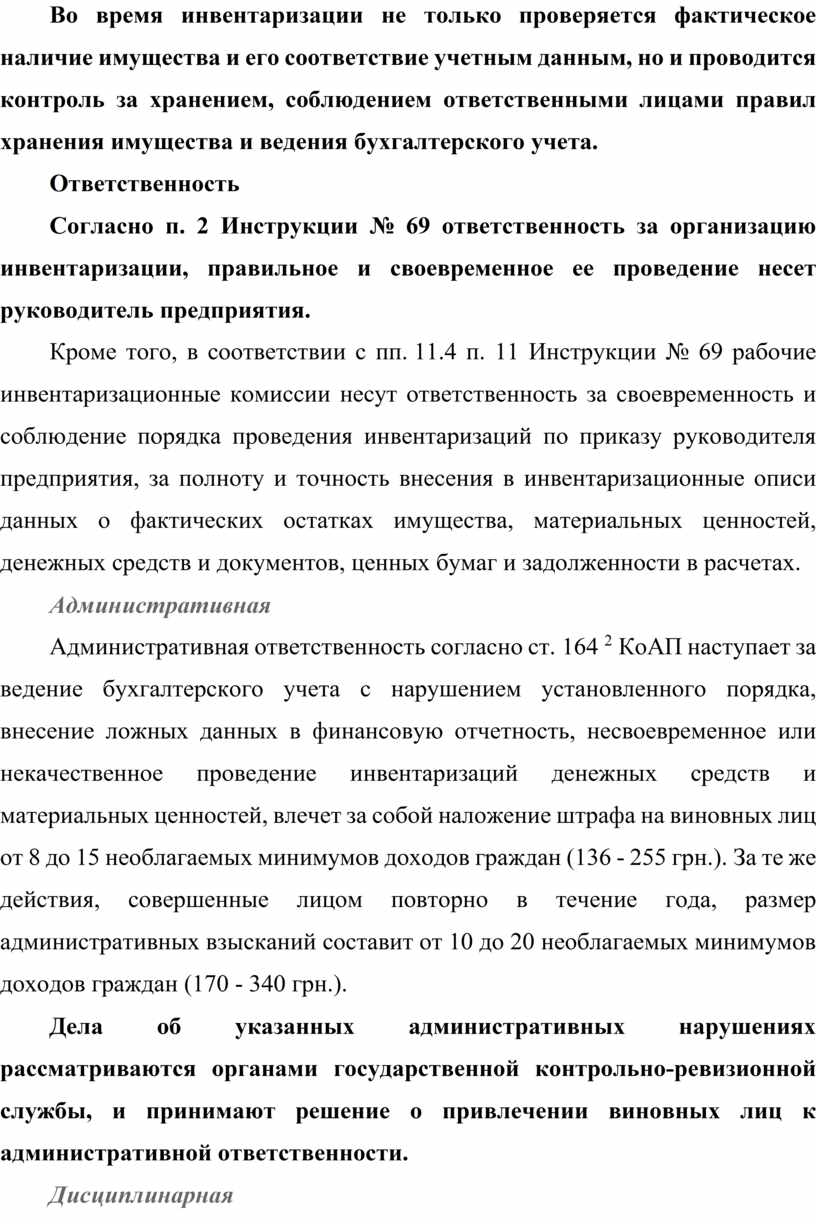 Кроме того, в соответствии с пп. 11.4 п. 11 Инструкции № 69 рабочие инвентаризационные комиссии несут ответственность за своевременность и соблюдение порядка проведения инвентаризаций по приказу руководителя предприятия, за полноту и точность внесения в инвентаризационные описи данных о фактических остатках имущества, материальных ценностей, денежных средств и документов, ценных бумаг и задолженности в расчетах.