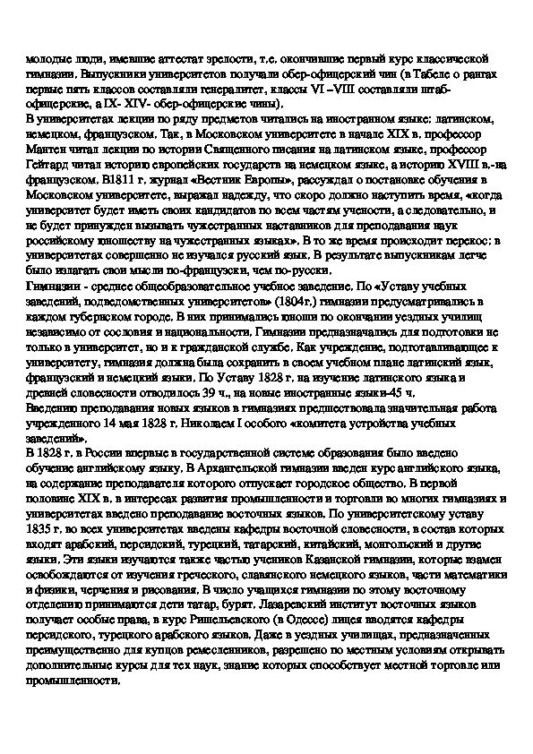 французский и немецкий языки. По Уставу 1828 г. на изучение латинского языка и