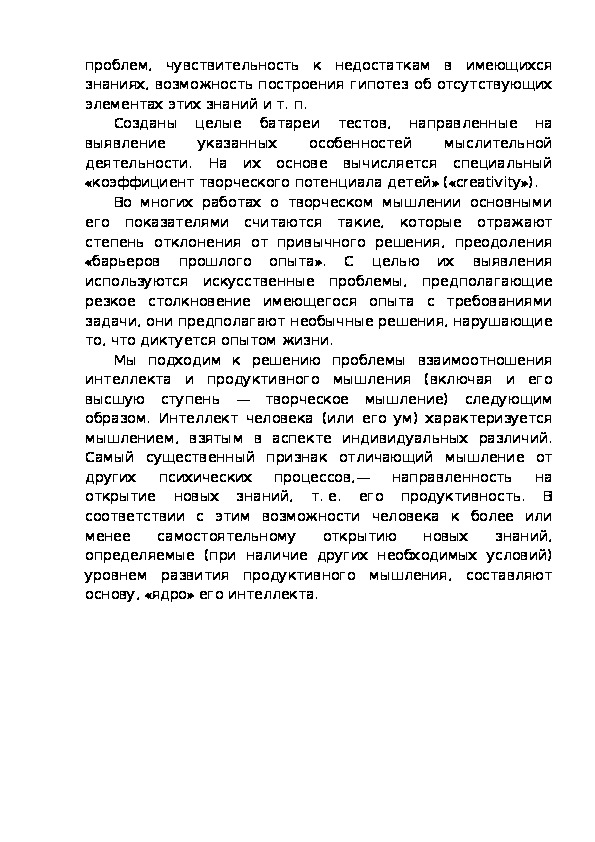 Решение задачи исследования творческого мышления предполагает выделение совокупности индивидуальных особенностей мышления, формирующихся качеств ума от которых зависит легкость овладения новыми знаниями, широта переноса, применения этих знаний на практике.