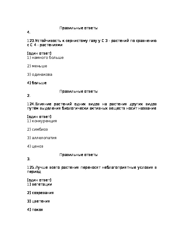 80% Правильные ответы 2. 114.Наиболее чувствительным к недостатку влаги является (один ответ) 1) цветение 2) рост листьев и побегов 3) созревание 4) рост корней Правильные ответы 2. 115.Жестколистные ксерофиты ( ковыль, типчак) переносят засуху в состоянии (один ответ) 1) образования семян 2) анабиоза 3) вегетации 4) тепловой смерти Правильные ответы 2. 116.Рис и болотные растения приспособились расти на затопляемых участках благодаря (один ответ) 1) фотосинтезу 2) больной корневой системе 3) наличию межклетников в корнях4) устойчивости к холоду Правильные ответы 3. 117.К гликогалофитам относятся (один ответ) 1) кермек 2) полынь, лебеда 3) амарикс 4) фасоль, редька Правильные ответы 2. 118.Для теплолюбивых растений оптимальными температурами являются (один ответ) 1) 20-25 2) 35-40 3) 30-35 4) 40-45 Правильные ответы 3. 119.Одной из причин гибели клеток при низких отрицательных температурах является (один ответ) 1) увеличение количества белков 2) оводнённость клеток 3) сильное обезвоживание клеток 4) повышение содержания сахаровПравильные ответы 3. 120.Температура, при которой рост растений прекращается, называется (один ответ) 1) термостойкость 2) холодостойкость 3) температурный стресс 4) температурный минимум Правильные ответы 4. 121.Основной причиной гибели растений под ледяной коркой является (один ответ) 1) прекращение аэрации 2) низкая температура 3) вымокание 4) плохая освещённость Правильные ответы 1. 122.Общие фенотипические признаки повреждения растений при действии на них вредных газов - это (один ответ) 1) снижение роста 2) отмирание побегов 3) запоздание цветения 4) некрозы и хлороз листьевПравильные ответы 4. 123.Устойчивость к сернистому газу у С 3 - растений по сравнению с С 4 - растениями (один ответ) 1) намного больше 2) меньше 3) одинакова 4) больше Правильные ответы 2. 124.Влияние растений одних видов на растения других видов путём выделения биологически активных веществ носит название (один ответ) 1) конкуренция 2) симбиоз 3) аллелопатия 4) ценоз Правильные ответы 3. 125.Лучше всего растения переносят неблагоприятные условия в период (один ответ) 1) вегетации 2) созревания 3) цветения 4) покояПравильные ответы 4. 126.Для теплолюбивых растений оптимальными температурами являются (один ответ) 1) 20-25 2) 30-35 3) 35-40 4) 40-45 Правильные ответы 2. 127.В основе молекулярной и клеточной биотехнологии лежит свойство (один ответ) 1) полярность 2) тотипотентность 3) деление клеток 4) толерантность Правильные ответы 2. 128.Температура, при которой рост растений прекращается, называется (один ответ) 1) термостойкость 2) температурный стресс 3) холодостойкость 4) температурный минимум Правильные ответы4. 129.Рис и болотные растения приспособились расти на затопляемых участках благодаря (один ответ) 1) наличию межклетников в корнях 2) больной корневой системе 3) фотосинтезу 4) устойчивости к холоду Правильные ответы 1. 130.К гликогалофитам относятся (один ответ) 1) кермек 2) тамарикс 3) полынь, лебеда 4) фасоль, редька Правильные ответы 3. 131.Основной принцип регуляции на уровне организма растений это наличие (один ответ) 1) доминирующих центров 2) проводящей системы 3) системы тканей 4) системы органов 1. Правильные ответы132.Влияние растений одних видов на растения других видов путём выделения биологически активных веществ носит название (один ответ) 1) конкуренция 2) аллелопатия 3) симбиоз 4) ценоз 2. Правильные ответы 133.Благоприятные усл