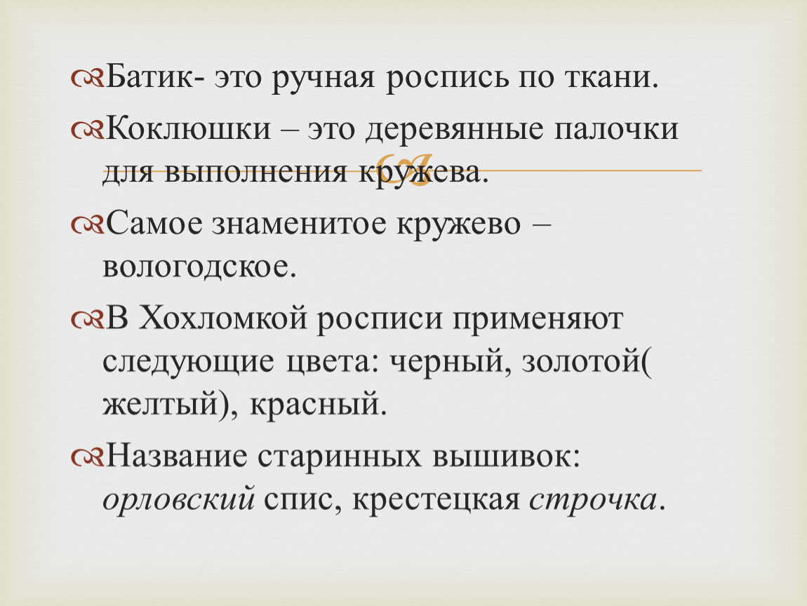 Название старинных вышивок: орловский спис, крестецкая строчка.