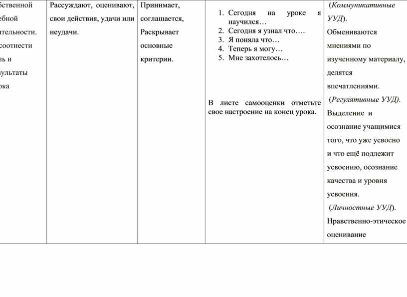 1. Сегодня на уроке я научился… 2. Сегодня я узнал что…. 3. Я поняла что… 4. Теперь я могу… 5. Мне захотелось…