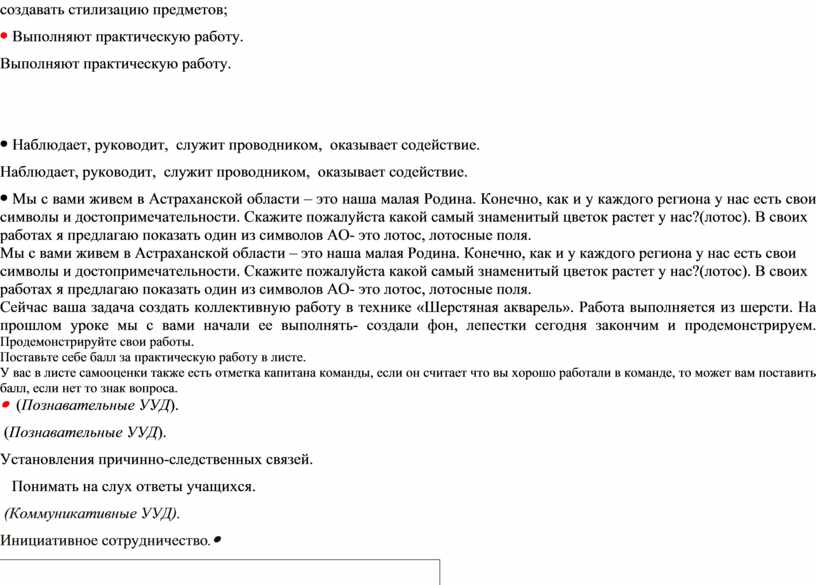 Мы с вами живем в Астраханской области – это наша малая Родина. Конечно, как и у каждого региона у нас есть свои символы и достопримечательности. Скажите пожалуйста какой самый знаменитый цветок растет у нас?(лотос). В своих работах я предлагаю показать один из символов АО- это лотос, лотосные поля. Сейчас ваша задача создать коллективную работу в технике «Шерстяная акварель». Работа выполняется из шерсти. На прошлом уроке мы с вами начали ее выполнять- создали фон, лепестки сегодня закончим и продемонстрируем. Продемонстрируйте свои работы. Поставьте себе балл за практическую работу в листе. У вас в листе самооценки также есть отметка капитана команды, если он считает что вы хорошо работали в команде, то может вам поставить балл, если нет то знак вопроса.