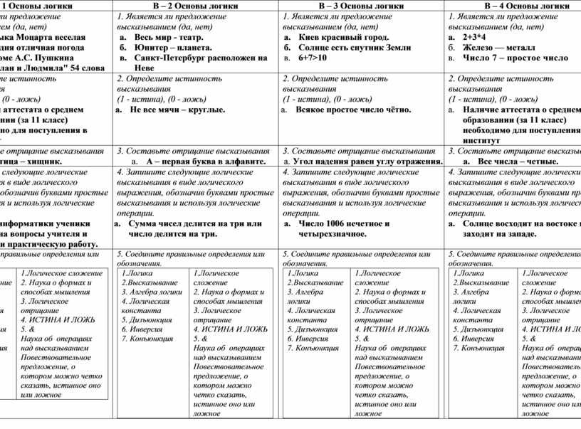 4. Запишите следующие логические высказывания в виде логического выражения, обозначив буквами простые высказывания и используя логические операции. а. На уроке информатики ученики отвечали на вопросы учителя и выполняли практическую работу. |