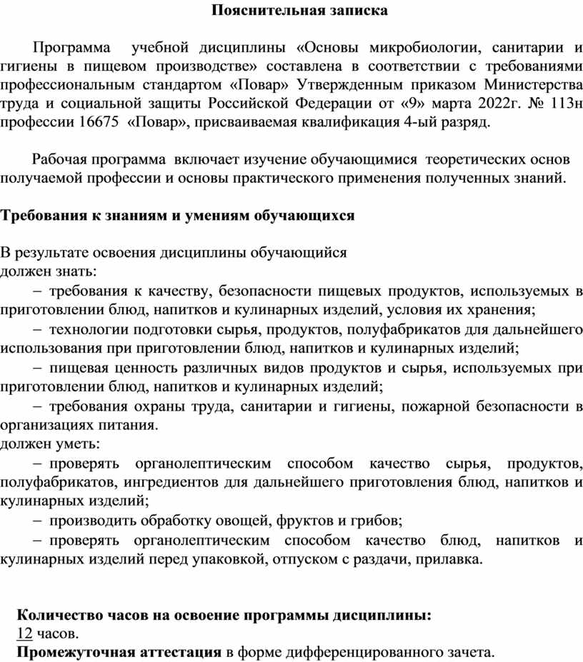 Программа учебной дисциплины «Основы микробиологии, санитарии и гигиены в пищевом производстве» составлена в соответствии с требованиями профессиональным стандартом «Повар» Утвержденным приказом Министерства труда и социальной защиты Российской Федерации от «9» марта 2022г. № 113н профессии 16675 «Повар», присваиваемая квалификация 4-ый разряд.