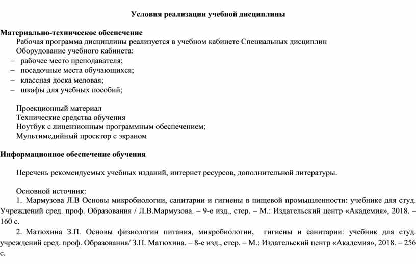 1. Мармузова Л.В Основы микробиологии, санитарии и гигиены в пищевой промышленности: учебнике для студ. Учреждений сред. проф. Образования / Л.В.Мармузова. – 9-е изд., стер. – М.: Издательский центр «Академия», 2018. – 160 с.