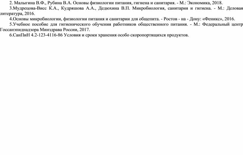 2. Малыгина В.Ф., Рубина В.А. Основы физиологии питания, гигиена и санитария. - М.: Экономика, 2018.