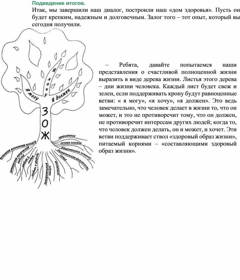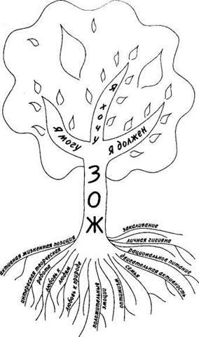– Ребята, давайте попытаемся наши представления о счастливой полноценной жизни выразить в виде дерева жизни. Листья этого дерева – дни жизни человека. Каждый лист будет свеж и зелен, если поддерживать крону будут равноценные ветви: « я могу», «я хочу», «я должен». Это ведь замечательно, что человек делает в жизни то, что он может, и это не противоречит тому, что он должен, не противоречит интересам других людей; когда то, что человек должен делать, он и может, и хочет. Эти ветви поддерживает ствол «здоровый образ жизни», питаемый корнями – «составляющими здоровый образ жизни».