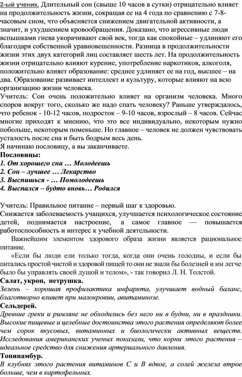 Учитель: Сон очень положительно влияет на организм человека. Много споров вокруг того, сколько же надо спать человеку? Раньше утверждалось, что ребенок - 10-12 часов, подросток – 9-10 часов, взрослый – 8 часов. Сейчас многие приходят к мнению, что это все индивидуально, некоторым нужно побольше, некоторым поменьше. Но главное – человек не должен чувствовать усталость после сна и быть бодрым весь день.