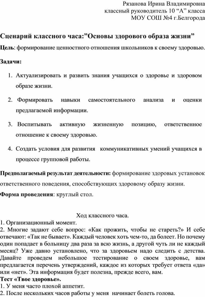 Сценарий классного часа:”Основы здорового образа жизни”
