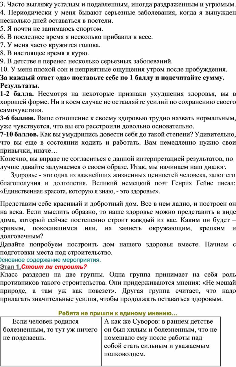 Класс разделен на две группы. Одна группа принимает на себя роль противников такого строительства. Они придерживаются мнения: «Не мешай природе, а там уж как повезет». Другая группа считает, что надо прилагать значительные усилия, чтобы продолжать оставаться здоровым.