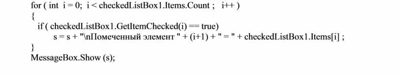 s = s + "\nПомеченный элемент " + (i+1) + " = " + checkedListBox1.Items[i] ;