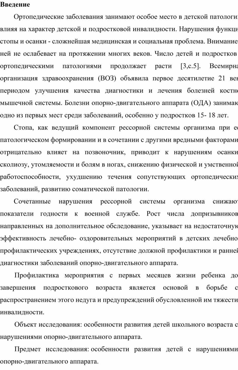 Ортопедические заболевания занимают особое место в детской патологии, влияя на характер детской и подростковой инвалидности. Нарушения функций стопы и осанки - сложнейшая медицинская и социальная проблема. Внимание к ней не ослабевает на протяжении многих веков. Число детей и подростков с ортопедическими патологиями продолжает расти [3,с.5]. Всемирная организация здравоохранения (ВОЗ) объявила первое десятилетие 21 века периодом улучшения качества диагностики и лечения болезней костно-мышечной системы. Болезни опорно-двигательного аппарата (ОДА) занимают одно из первых мест среди заболеваний, особенно у подростков 15- 18 лет.