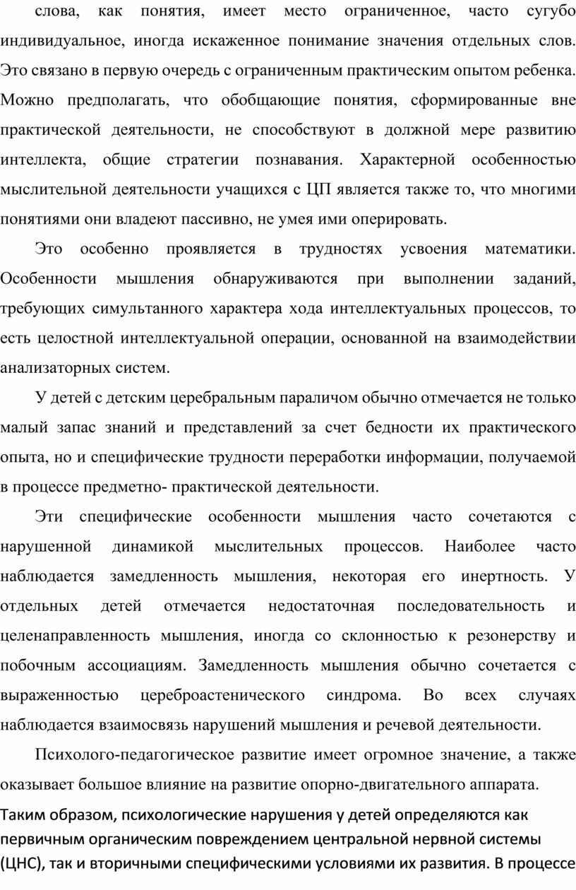 Нарушения мыслительной деятельности проявляются в недостаточной сформированности понятийного, абстрактного мышления, что в значительной степени обусловлено нарушениями семантической стороны речи. Несмотря на то, что у многих детей к началу обучения в школе может быть формально достаточный словарный запас, наблюдается задержанное формирование слова, как понятия, имеет место ограниченное, часто сугубо индивидуальное, иногда искаженное понимание значения отдельных слов. Это связано в первую очередь с ограниченным практическим опытом ребенка. Можно предполагать, что обобщающие понятия, сформированные вне практической деятельности, не способствуют в должной мере развитию интеллекта, общие стратегии познавания. Характерной особенностью мыслительной деятельности учащихся с ЦП является также то, что многими понятиями они владеют пассивно, не умея ими оперировать.