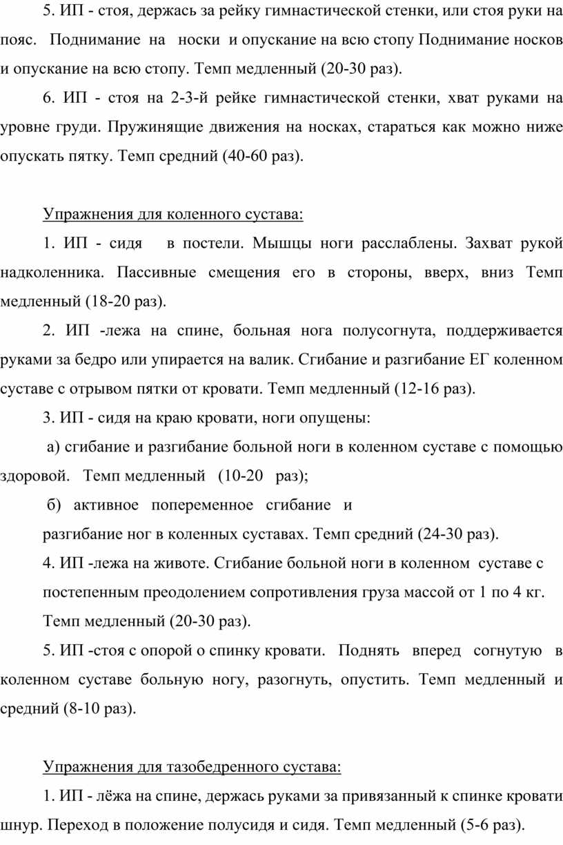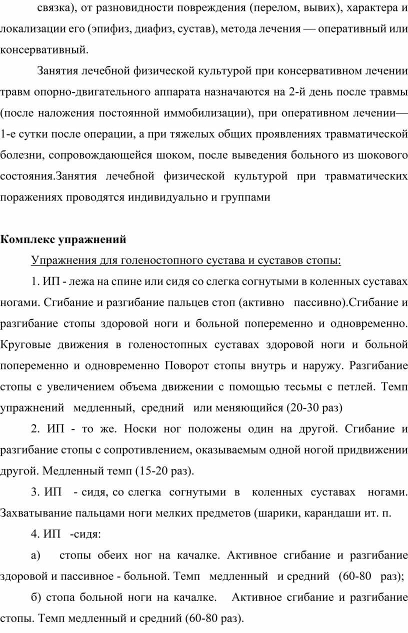 1. ИП - лежа на спине или сидя со слегка согнутыми в коленных суставах ногами. Сгибание и разгибание пальцев стоп (активно пассивно).Сгибание и разгибание стопы здоровой ноги и больной попеременно и одновременно. Круговые движения в голеностопных суставах здоровой ноги и больной попеременно и одновременно Поворот стопы внутрь и наружу. Разгибание стопы с увеличением объема движении с помощью тесьмы с петлей. Темп упражнений медленный, средний или меняющийся (20-30 раз)