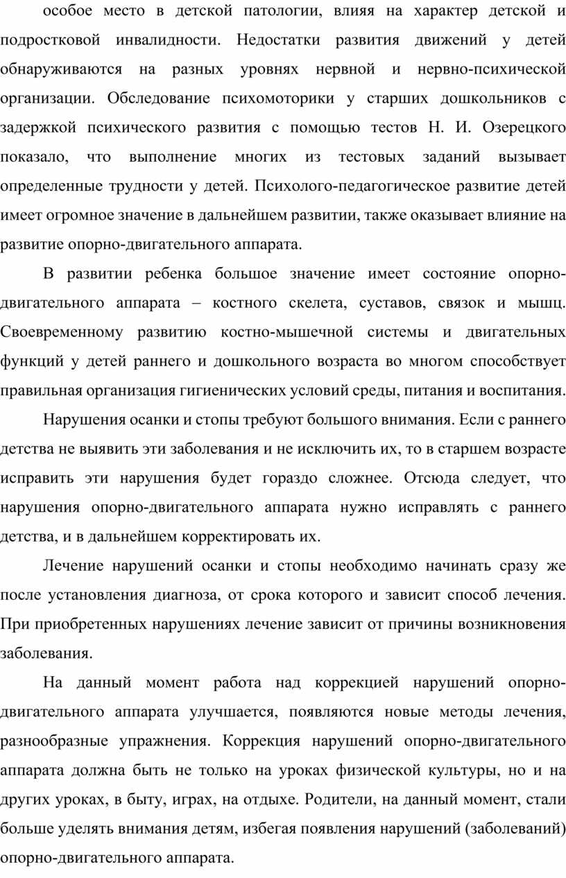 Изучив научно-медицинскую и психолого-педагогическую литературу по данной теме, мы пришли к выводу, что вопрос о развитии детей с нарушениями опорно-двигательного аппарата на данный момент является очень актуальным. Заболевания опорно-двигательного аппарата занимают особое место в детской патологии, влияя на характер детской и подростковой инвалидности. Недостатки развития движений у детей обнаруживаются на разных уровнях нервной и нервно-психической организации. Обследование психомоторики у старших дошкольников с задержкой психического развития с помощью тестов Н. И. Озерецкого показало, что выполнение многих из тестовых заданий вызывает определенные трудности у детей. Психолого-педагогическое развитие детей имеет огромное значение в дальнейшем развитии, также оказывает влияние на развитие опорно-двигательного аппарата.