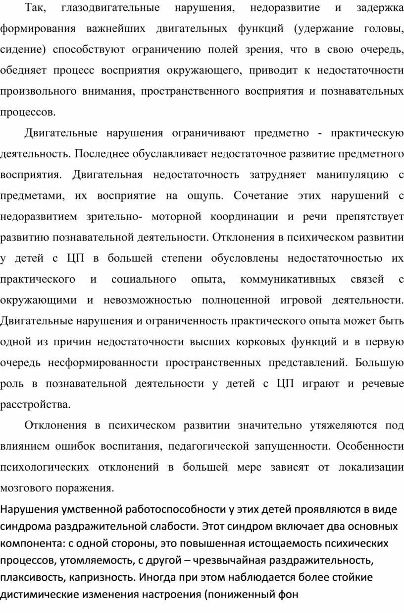 Двигательные нарушения ограничивают предметно - практическую деятельность. Последнее обуславливает недостаточное развитие предметного восприятия. Двигательная недостаточность затрудняет манипуляцию с предметами, их восприятие на ощупь. Сочетание этих нарушений с недоразвитием зрительно- моторной координации и речи препятствует развитию познавательной деятельности. Отклонения в психическом развитии у детей с ЦП в большей степени обусловлены недостаточностью их практического и социального опыта, коммуникативных связей с окружающими и невозможностью полноценной игровой деятельности. Двигательные нарушения и ограниченность практического опыта может быть одной из причин недостаточности высших корковых функций и в первую очередь несформированности пространственных представлений. Большую роль в познавательной деятельности у детей с ЦП играют и речевые расстройства.