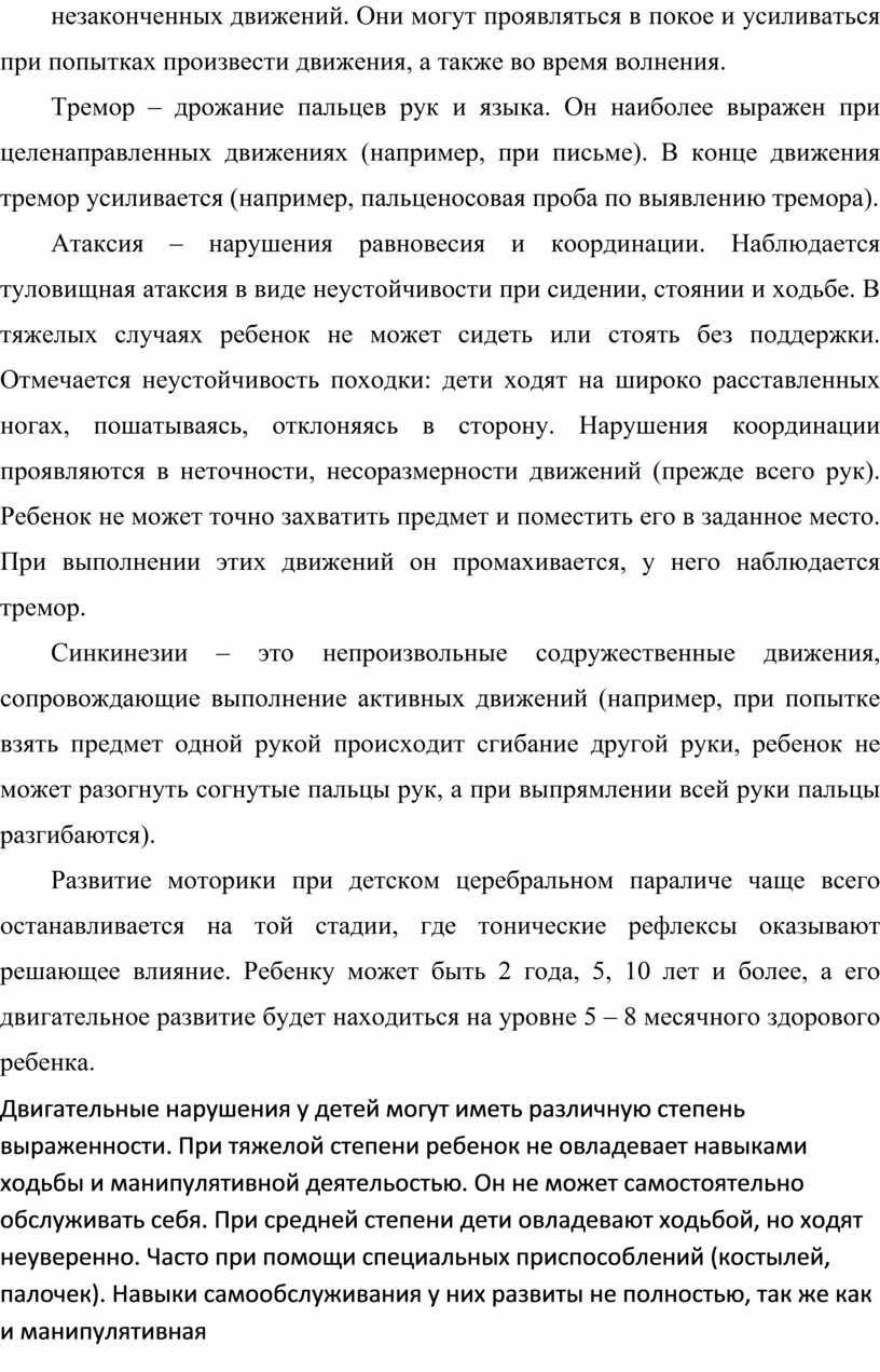 У детей с детским церебральным параличом задержано и нарушено формирование всех двигательных функций. С трудом и опозданием формируется функция удержания головы, навыки сидения, стояния, ходьбы, манипулятивной деятельности. Двигательные нарушения, являясь ведущим дефектом, без соответствующей коррекции оказывают неблагоприятное влияние на формирование психических функций и речи.