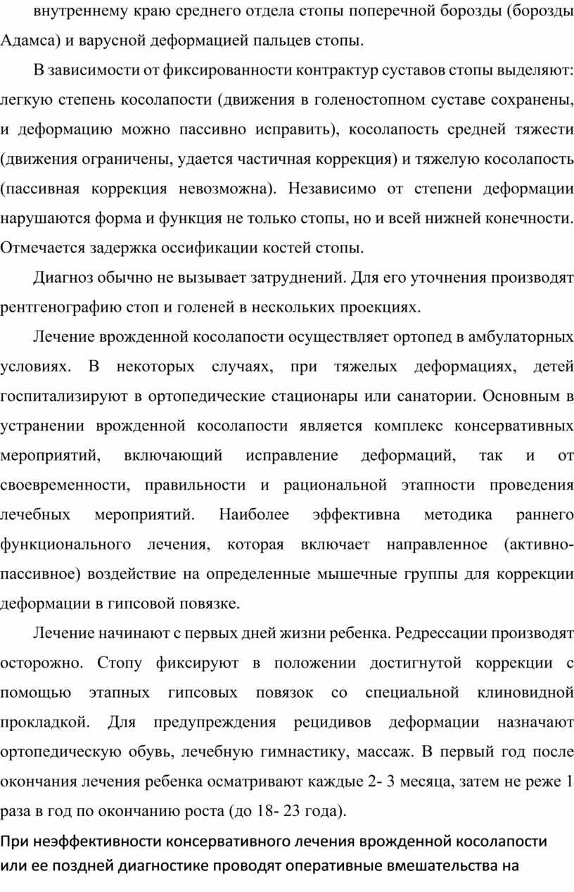 Лечение начинают с первых дней жизни ребенка. Редрессации производят осторожно. Стопу фиксируют в положении достигнутой коррекции с помощью этапных гипсовых повязок со специальной клиновидной прокладкой. Для предупреждения рецидивов деформации назначают ортопедическую обувь, лечебную гимнастику, массаж. В первый год после окончания лечения ребенка осматривают каждые 2- 3 месяца, затем не реже 1 раза в год по окончанию роста (до 18- 23 года).