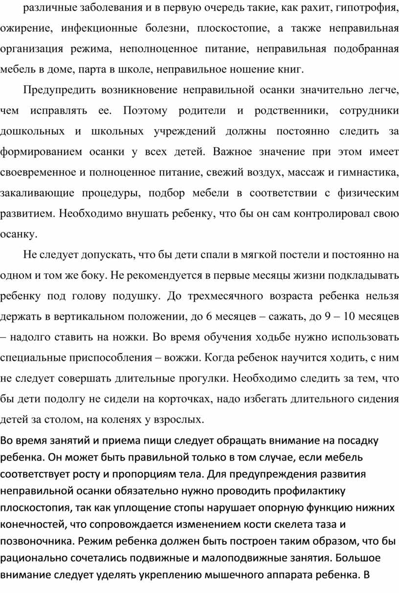 Не следует допускать, что бы дети спали в мягкой постели и постоянно на одном и том же боку. Не рекомендуется в первые месяцы жизни подкладывать ребенку под голову подушку. До трехмесячного возраста ребенка нельзя держать в вертикальном положении, до 6 месяцев – сажать, до 9 – 10 месяцев – надолго ставить на ножки. Во время обучения ходьбе нужно использовать специальные приспособления – вожжи. Когда ребенок научится ходить, с ним не следует совершать длительные прогулки. Необходимо следить за тем, что бы дети подолгу не сидели на корточках, надо избегать длительного сидения детей за столом, на коленях у взрослых.