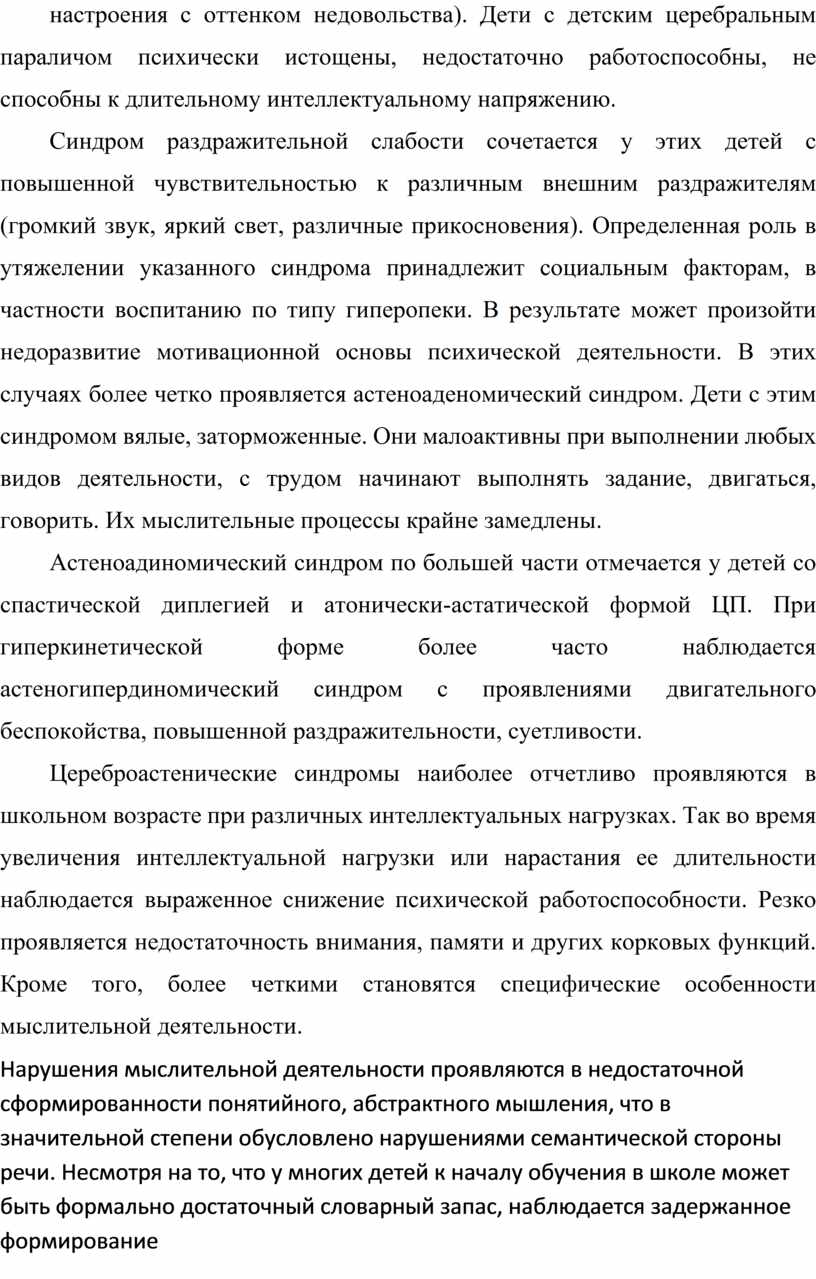 Нарушения умственной работоспособности у этих детей проявляются в виде синдрома раздражительной слабости. Этот синдром включает два основных компонента: с одной стороны, это повышенная истощаемость психических процессов, утомляемость, с другой – чрезвычайная раздражительность, плаксивость, капризность. Иногда при этом наблюдается более стойкие дистимические изменения настроения (пониженный фон настроения с оттенком недовольства). Дети с детским церебральным параличом психически истощены, недостаточно работоспособны, не способны к длительному интеллектуальному напряжению.
