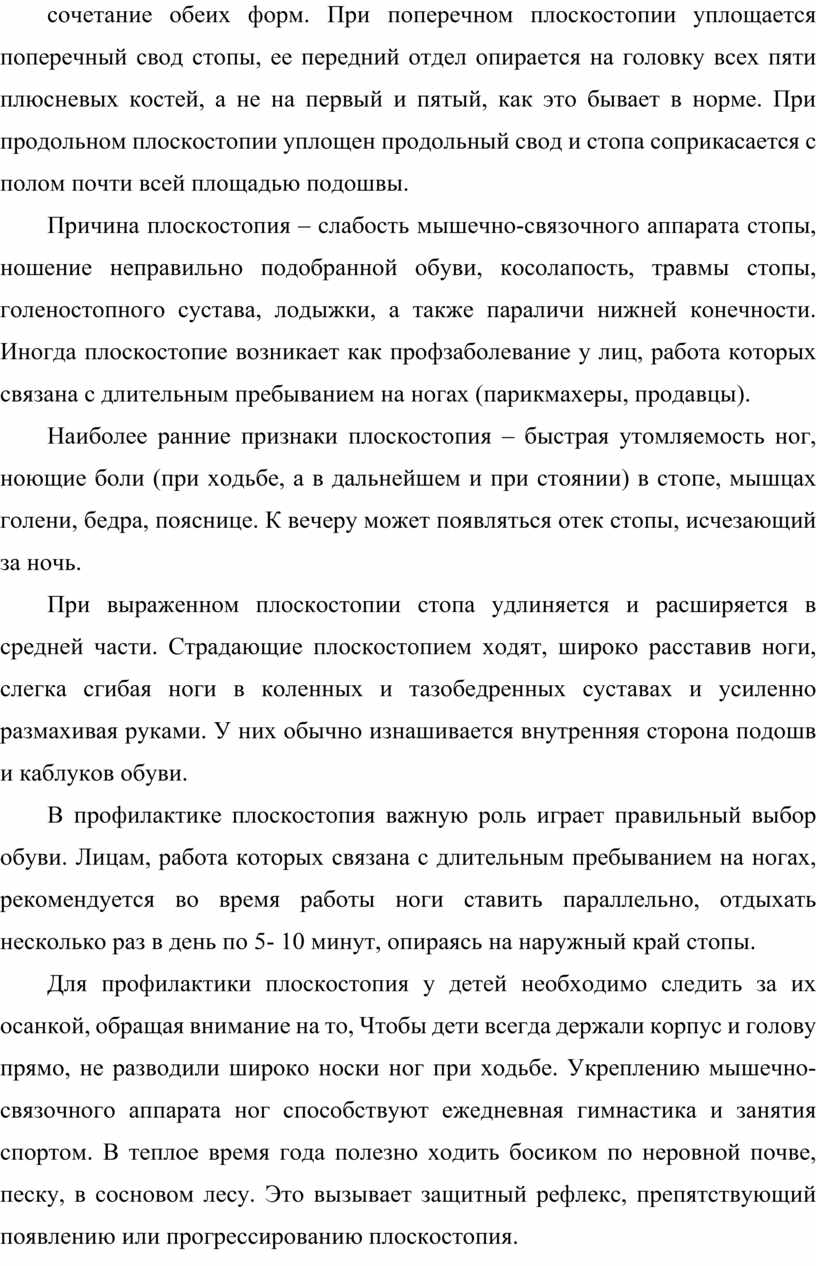 Плоскостопие - это деформация стопы, характеризующаяся ее уплощением. Различают продольное и поперечное плоскостопие, возможно сочетание обеих форм. При поперечном плоскостопии уплощается поперечный свод стопы, ее передний отдел опирается на головку всех пяти плюсневых костей, а не на первый и пятый, как это бывает в норме. При продольном плоскостопии уплощен продольный свод и стопа соприкасается с полом почти всей площадью подошвы.