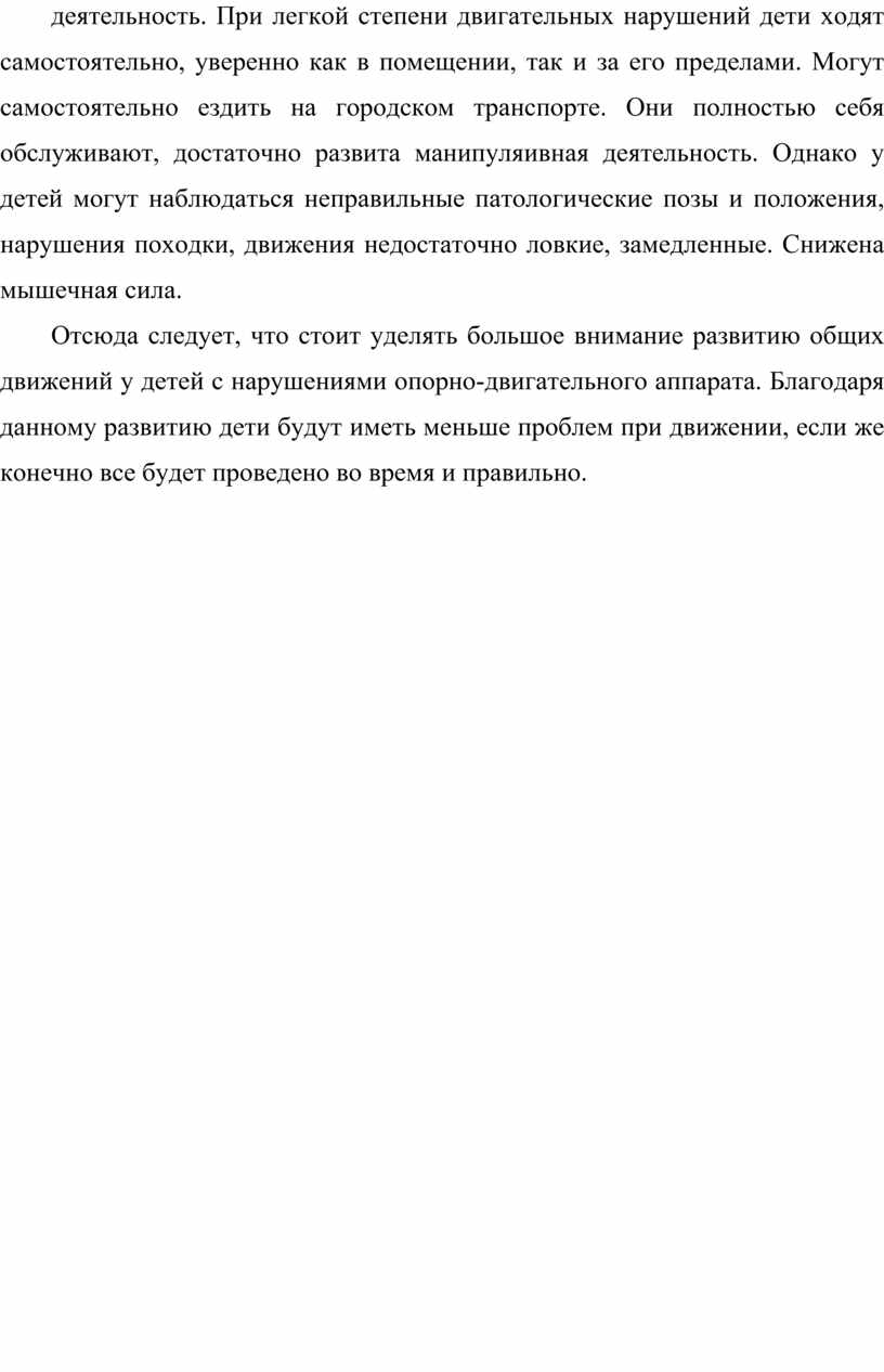Отсюда следует, что стоит уделять большое внимание развитию общих движений у детей с нарушениями опорно-двигательного аппарата. Благодаря данному развитию дети будут иметь меньше проблем при движении, если же конечно все будет проведено во время и правильно.
