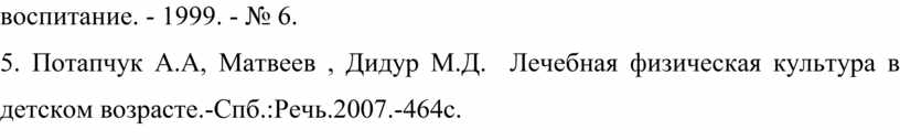 5. Потапчук А.А, Матвеев , Дидур М.Д. Лечебная физическая культура в детском возрасте.-Спб.:Речь.2007.-464с.