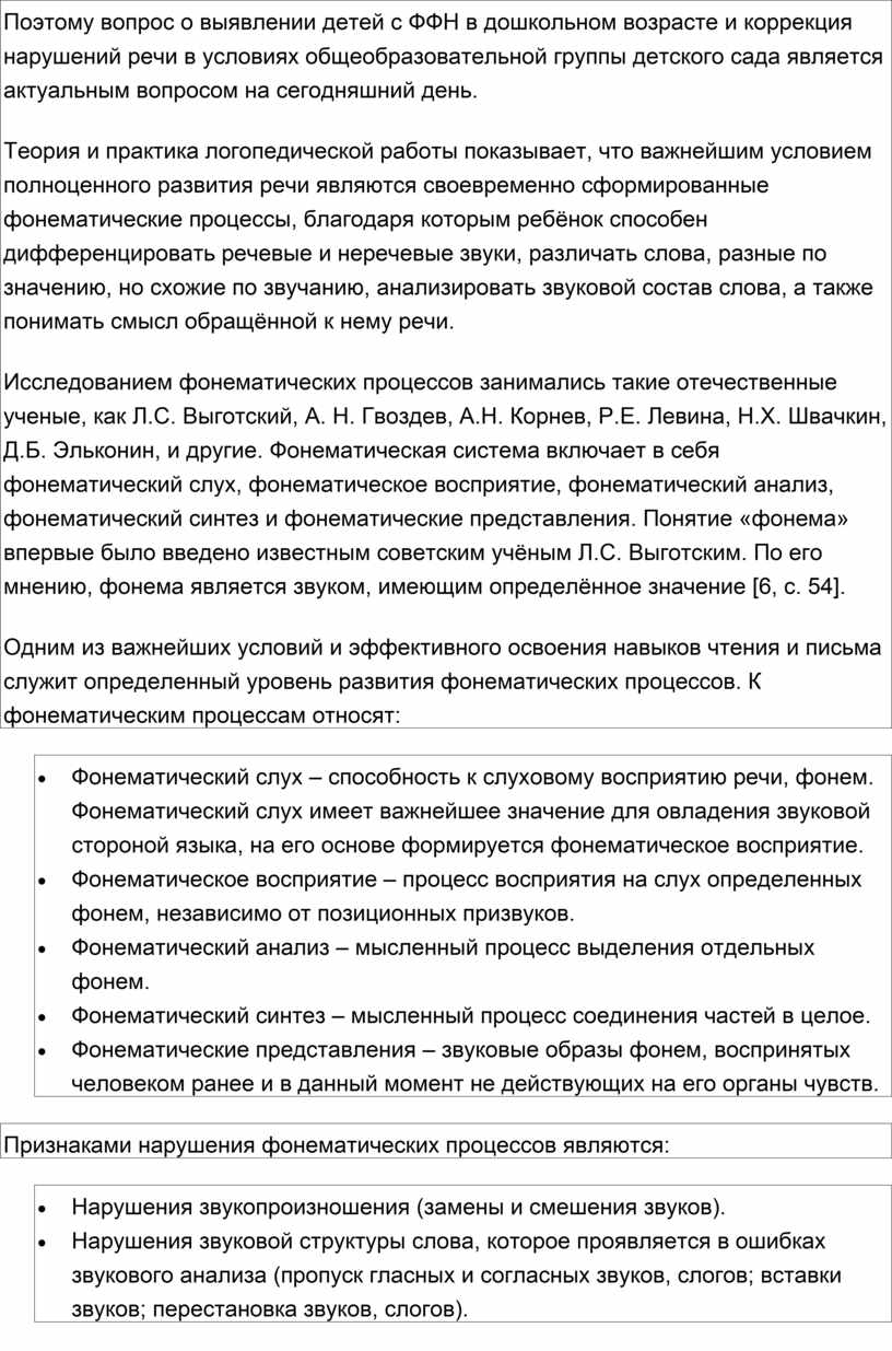 Поэтому вопрос о выявлении детей с ФФН в дошкольном возрасте и коррекция нарушений речи в условиях общеобразовательной группы детского сада является актуальным вопросом на сегодняшний день.