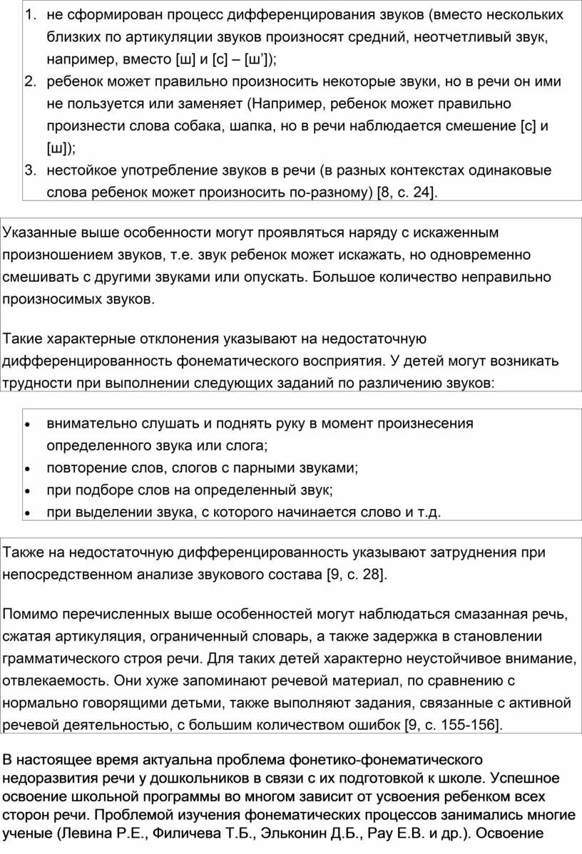 Недоразвитие фонетико-фонематической стороны речи указывают на недостаточно развитый фонематический слух и фонематическое восприятие, что является причиной нарушений звукопроизношения. Дети, имеющие ФФНР, могут заменять одни звуки другими, могут отдельно произносить звуки правильно, а в речи употреблять их неверно. Также у них наблюдается несформированность процесса дифференциации отдельных звуков и нестойкость употребления звуков в речи. Они сравнительно хуже запоминают речевой материал, чем нормально говорящие дети, делают большое количество ошибок, связанных с активной речевой деятельностью [10, с. 34].