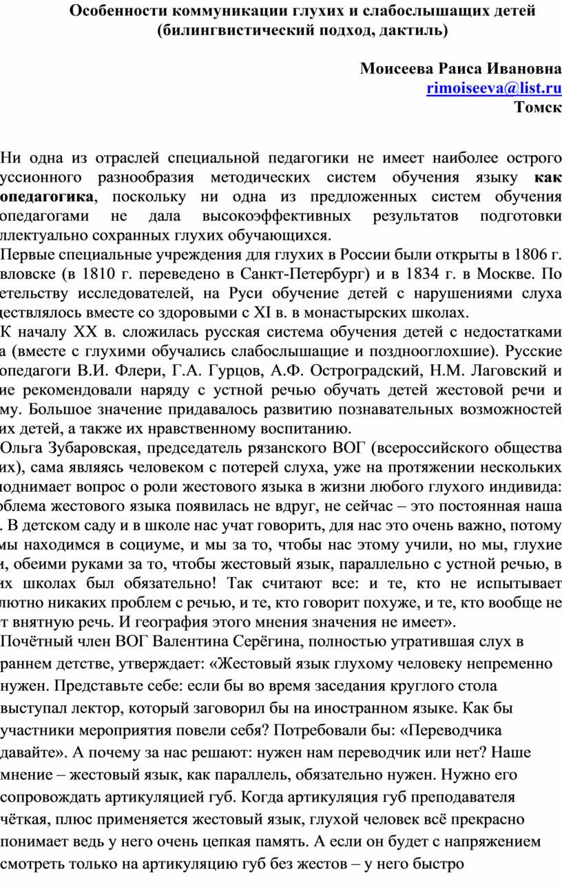 Особенности коммуникации глухих и слабослышащих детей (билингвистический подход, дактиль)
